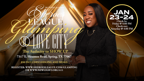 Sheroes League Presents: Glamping @ LOVE City, January 23-24, 2025; Check-In-Friday 6:00 PM; Check-Out Saturday 1:00 PM, LOVE City, 7317 E. Houston Road, Houston, TX 77028; $40 includes lodging & meals *If you wanted to attend summer camp as a teen, this elevated overnight experience is tailored for today's Shero.